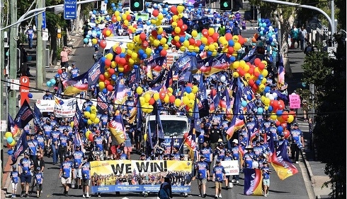 Avusturalya'da balonlarla yürüyen kalabalığın pankartlarında "Biz kazanıyoruz" yazılı.