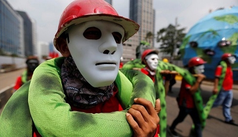 Endonezyalı işçiler, protestolarda maskelerle yürüdü.