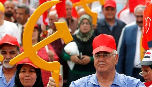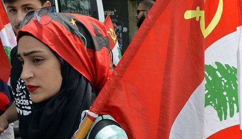 Lübnan Komunist Partisi'nin Beyrut'taki yürüyüşünde bayrak taşıyan işçiler