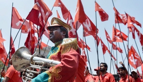 Hindistan Bengaluru'da işçiler geleneksel işçi bayramı kutlamalarında kırmızı uniformalarının içinde