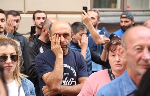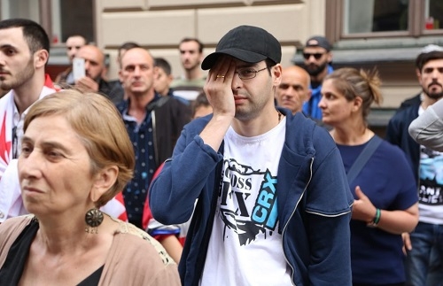Stockholm'daki Protestocular, Tiflis'teki protestoların güvenlik güçleri tarafından bastırılması sırasında iki göstericinin gözlerini kaybetmesini temsilen bir elleriyle tek gözlerini kapattılar