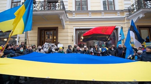 Estonya'nın başkenti Talin'de düzenlenen protesto eyleminde dev Ukrayna bayrağı açıldı.