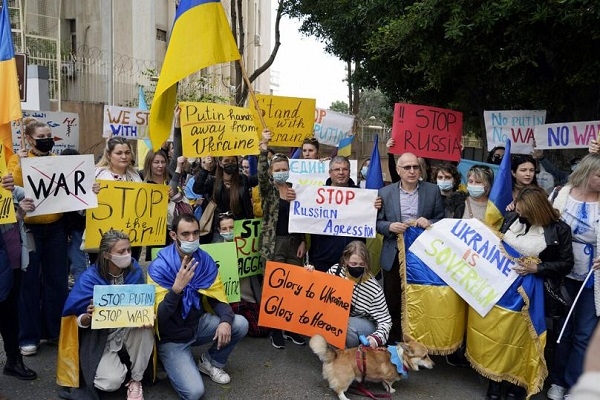Lübnan'ın başkenti Beyrut'taki Rusya Büyükelçiliği önünde düzenlenen protesto eyleminde ülkede yaşayan Ukraynalılar ellerinde Rusya aleyhine pankartlar ve Ukrayna bayrakları ile tepkilerini duyurdu.